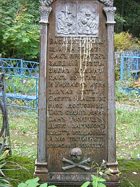 На кладбище много интересных захоронений XIXв., которые еще ждут своих исследователей. Вот чудом сохранившийся чугунный обелиск «купеческаго сына Михайлы Алексеевича Новикова, скончавшагося 1852г. iюля 26-го дня житiя его было 17 летъ и 3 дня»